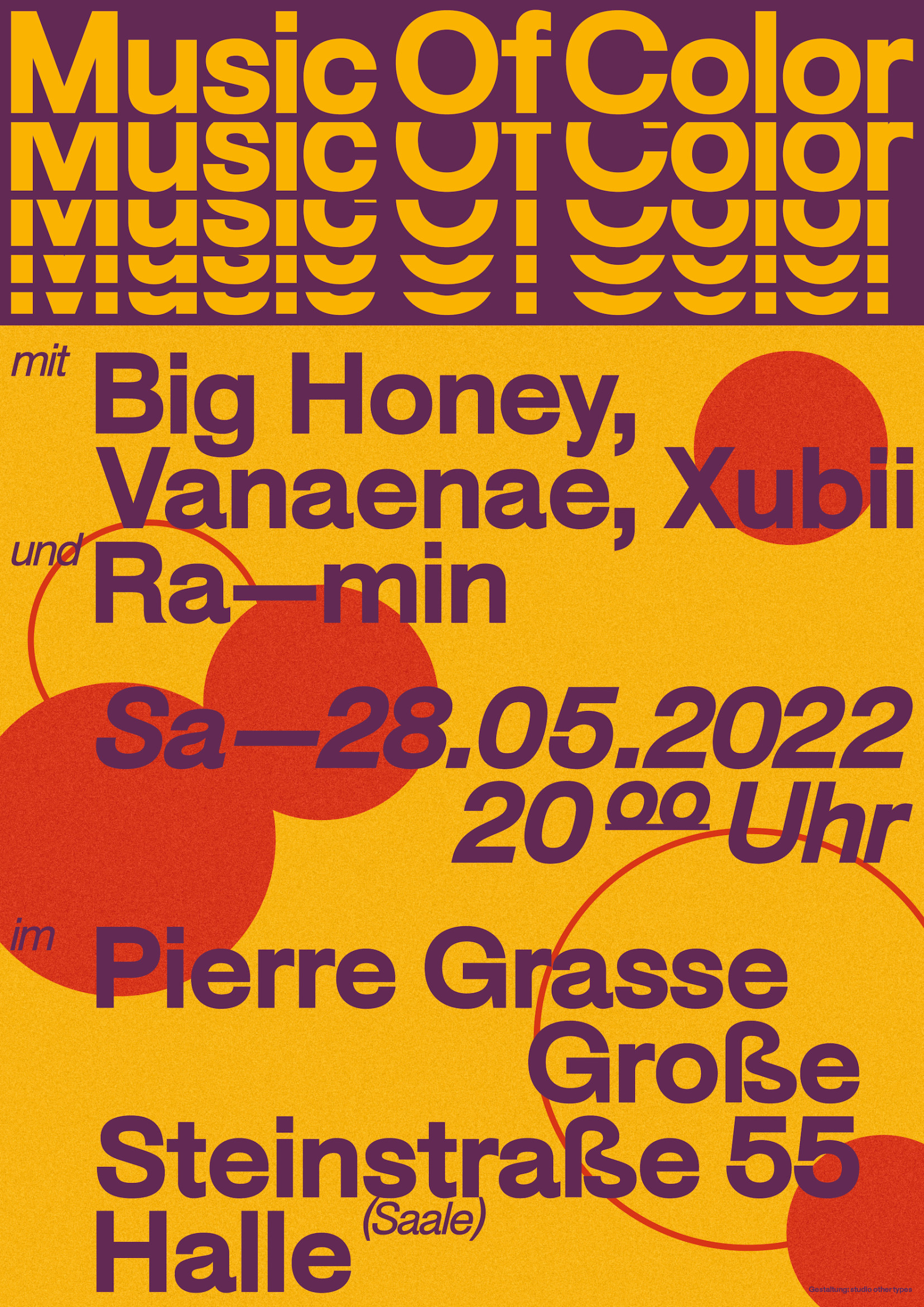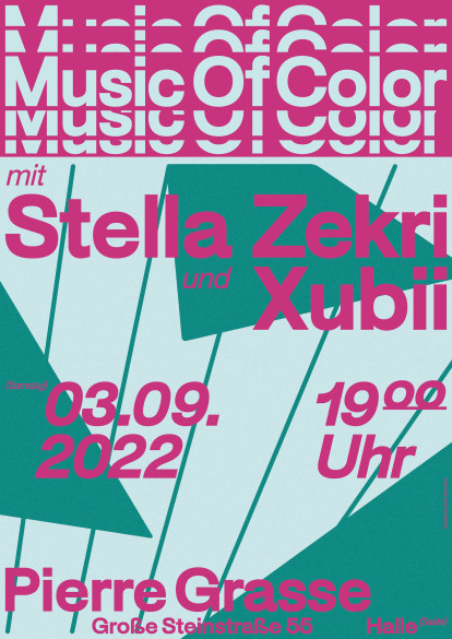 Plakatserie für eine fortlaufende Tanzveranstaltung des Kollektivs Music Of Color in Halle an der Saale. Formen und Farben strahlen eine klangvolle Atmosphäre aus und illustrieren die Offenheit und Vielfalt der gespielten Musik und der Menschen, die zusammenkommen.