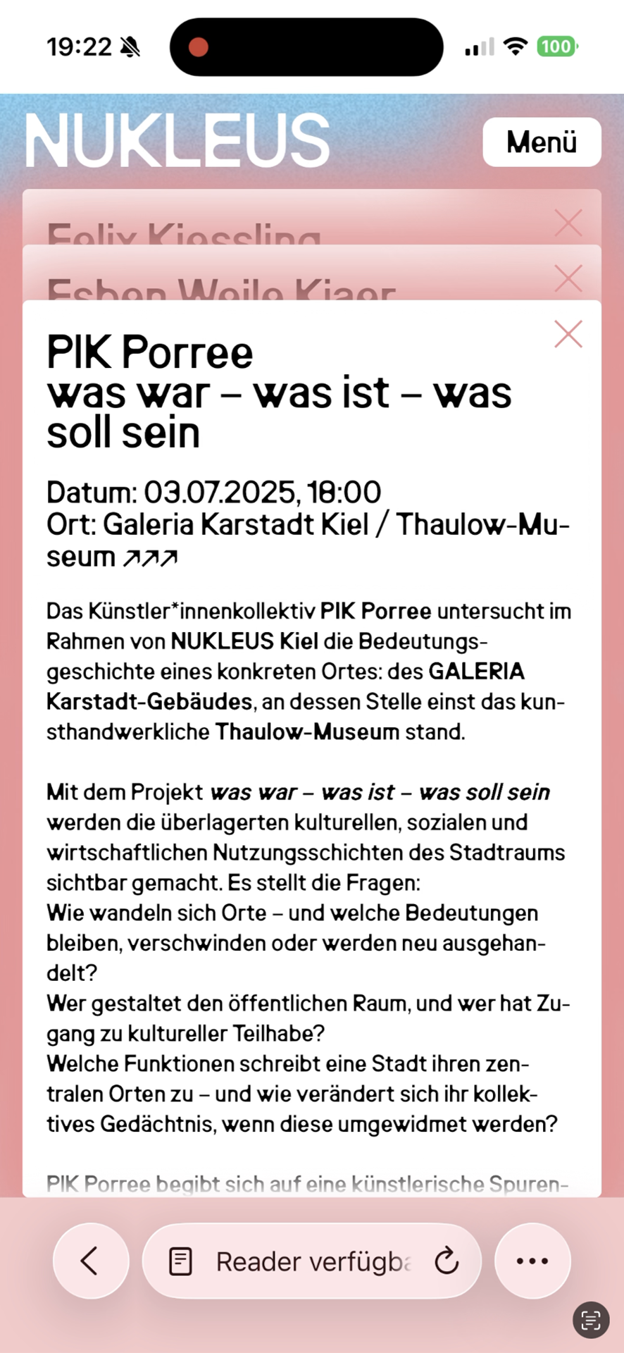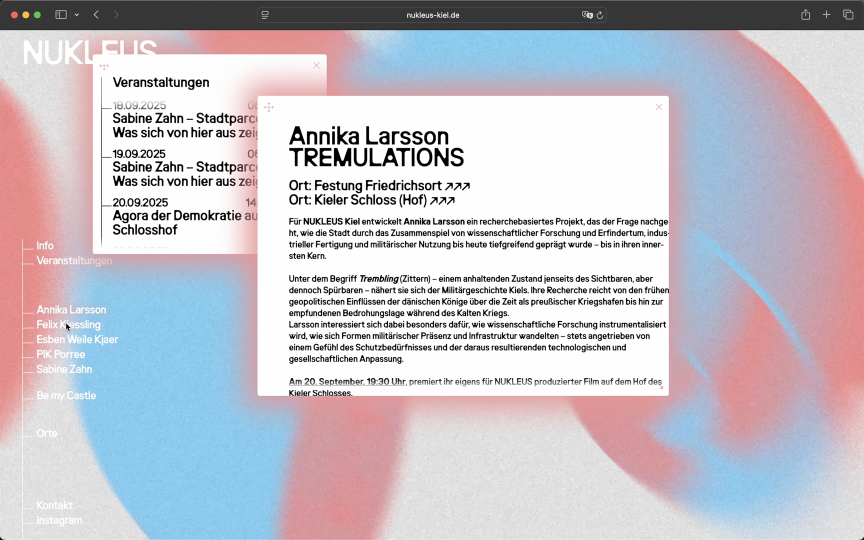 NUKLEUS Kiel ist ein interdisziplinäres Kunstprojekt, das den Stadtraum Kiels als Forschungsfeld versteht. Internationale Künstler*innen und lokale Studierende der Muthesius Kunsthochschule arbeiten über mehrere Monate hinweg an künstlerischen Interventionen, die Fragen nach urbaner Teilhabe, öffentlichem Raum und demokratischem Miteinander aufwerfen.