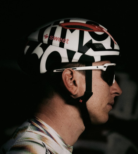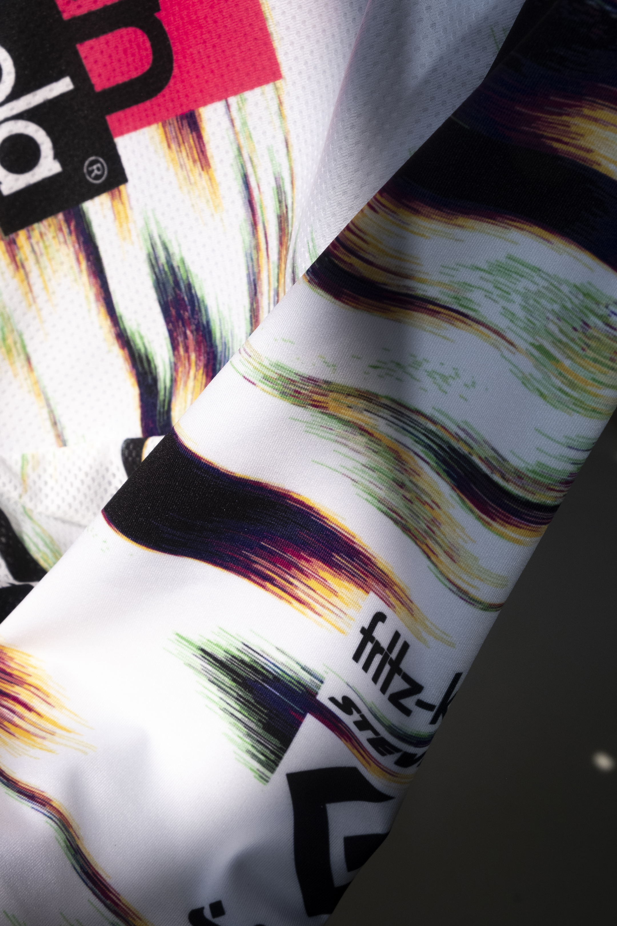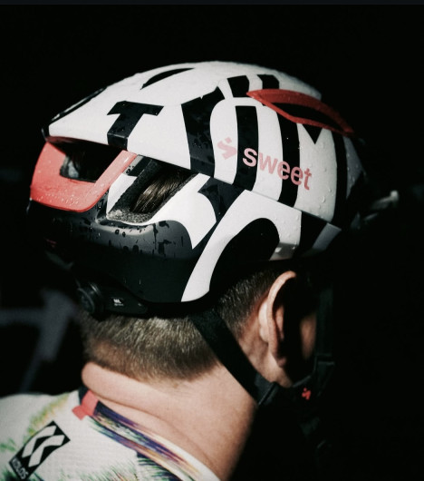 Ergänzend dazu entstand gemeinsam mit Sweet Protection ein individuell gestalteter Helm für das Team. Die Gestaltung ist bewusst grafisch gehalten: Großflächig verzerrte Buchstaben ziehen sich über die Helmform und werden durch den pinken Farbton akzentuiert, der auch im Teamkit aufgegriffen wird.
