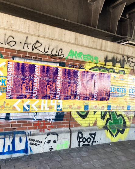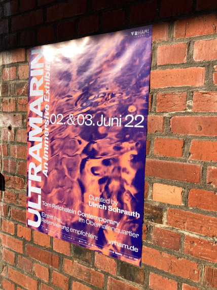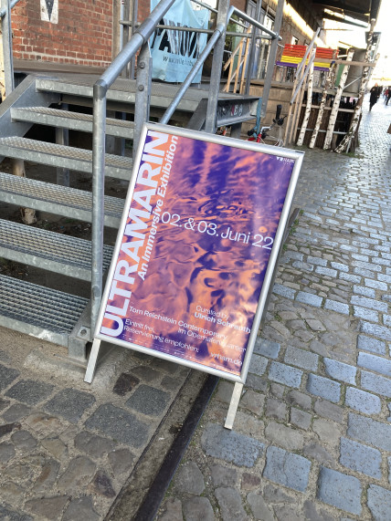 Plakatgestaltung für die Ausstellung ULTRAMARIN – An Immersive Exhibition. Die Ausstellung zeigt internationale Kunstwerke rund um das Thema ‚Wasser’ und präsentiert Arbeiten aus den Bereichen Virtual und Augmented Reality, Mixed Media und Projection Mapping. Der Ausstellungsraum ist in tiefes Blau getaucht und lässt die Besucher*innen gänzlich eintauchen.
