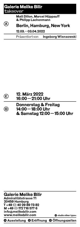 Eine Übersicht der Flyer, die für die verschiedenen Ausstellungen in der Galerie Melike Bilir im Jahr 2021 entstanden sind. Die Flyer zeichnen sich durch einen spielerischen Umgang mit Schrift aus und bleiben stets im Rahmen der Corporate Identity der Galerie.