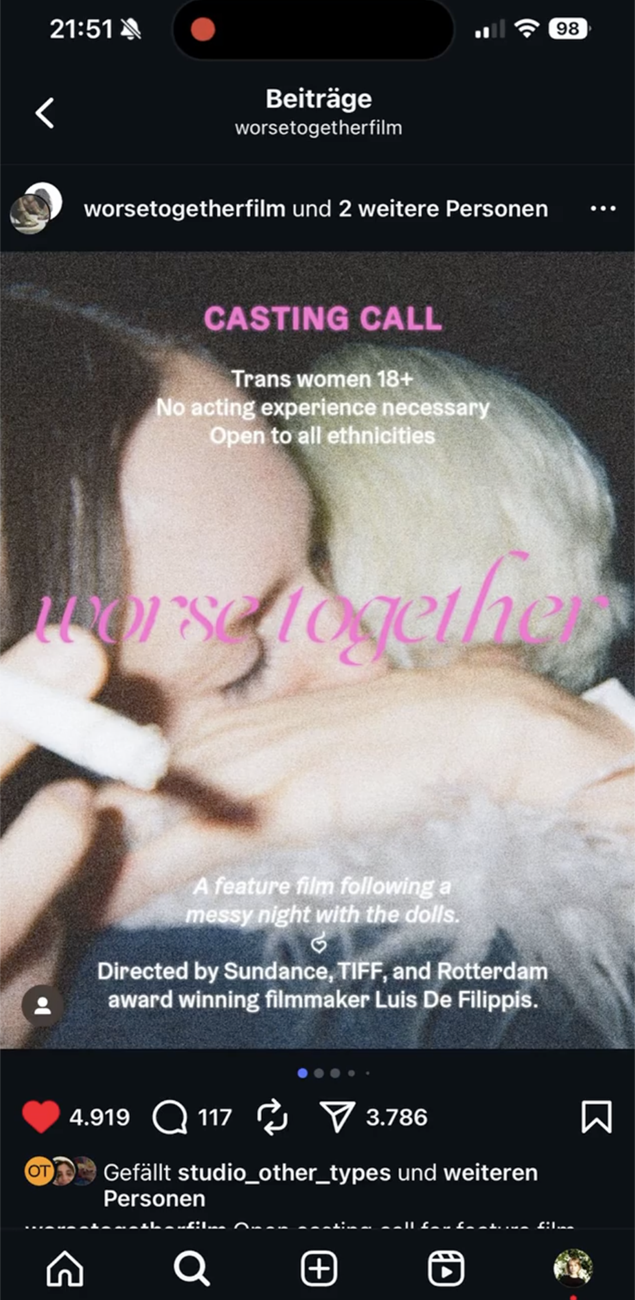 Title design and social media content for the casting call for Luis De Filippis' upcoming feature film Worse Together.