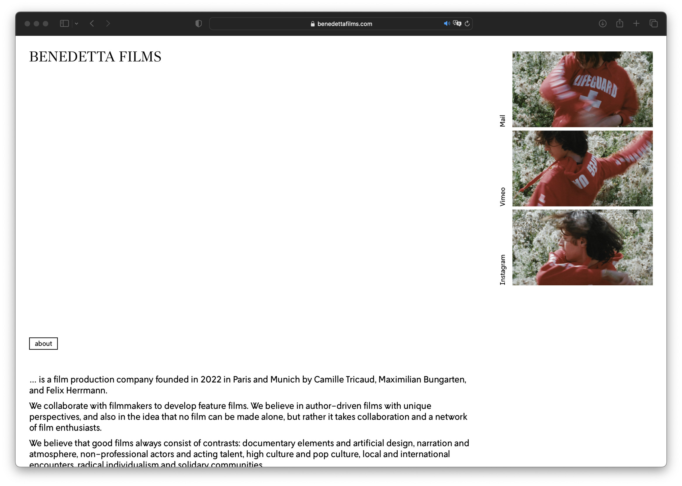 Benedetta Films is a film production company founded in 2022 in Paris and Munich by Camille Tricaud, Maximilian Bungarten, and Felix Herrmann.They collaborate with filmmakers to develop feature films. They believe in author-driven films with unique perspectives, and also in the idea that no film can be made alone, but rather it takes collaboration and a network of film enthusiasts.Good films always consist of contrasts: documentary elements and artificial design, narration and atmosphere, non-professional actors and acting talent, high culture and pop culture, local and international encounters, radical individualism and solidary communities.