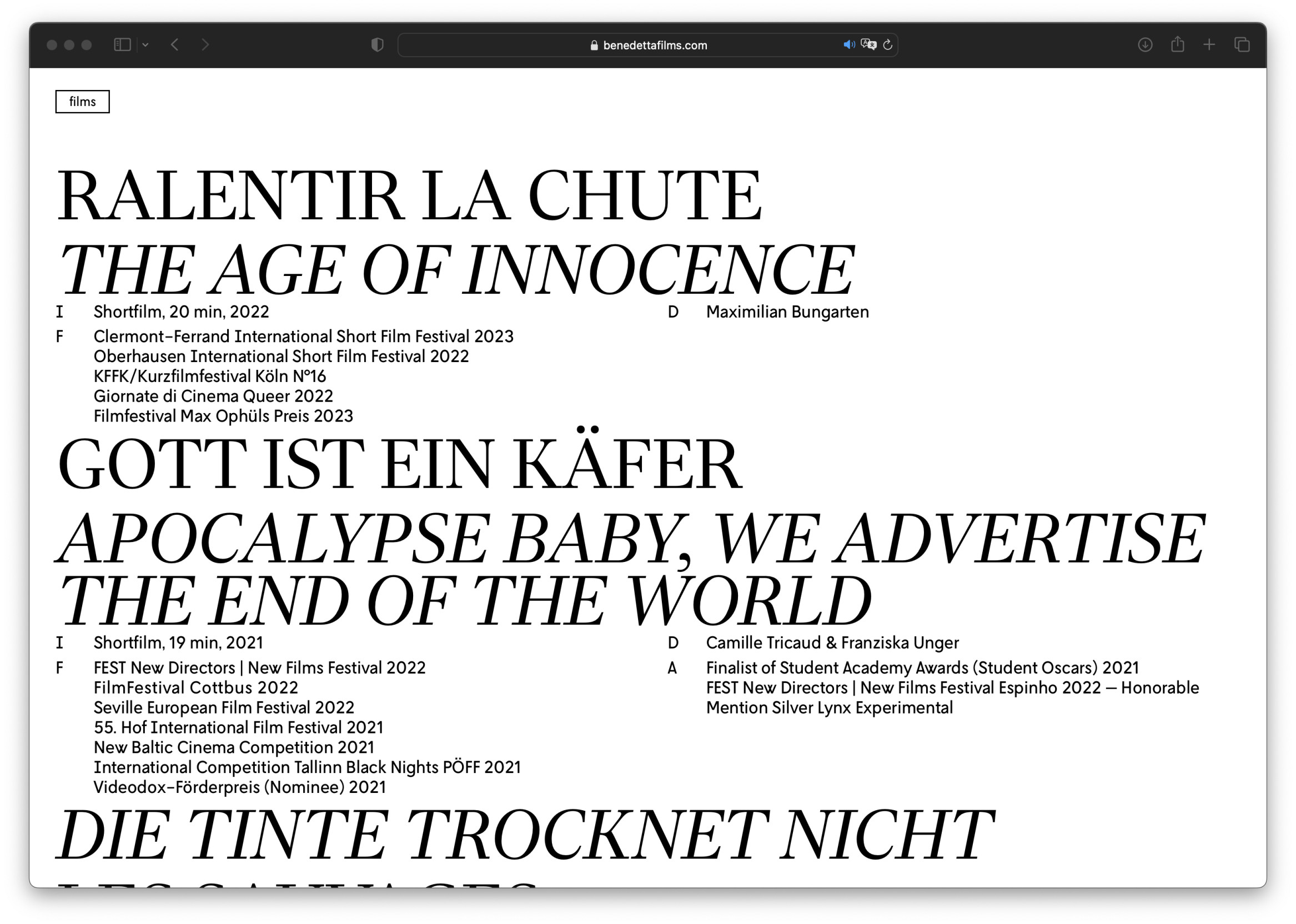The newly created onepager-website shows their recent films as well as the collaborating partners and festivals where the films were screened.