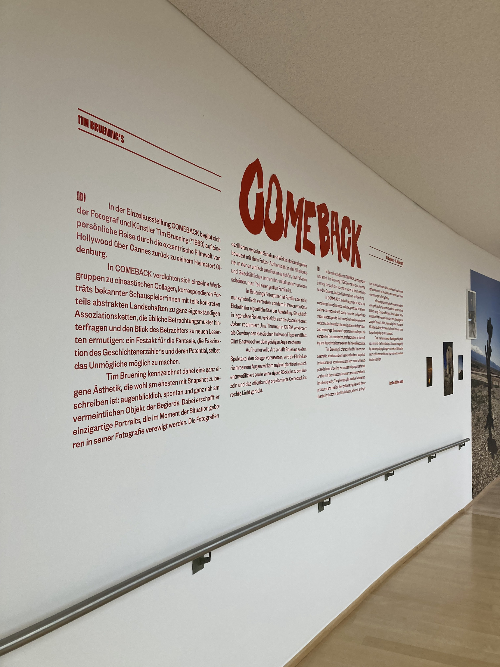 COMEBACK is a solo exhibition by photographer Tim Bruening at the Horst-Janssen Museum in Oldenburg. In his work, the photographer explores the theme of cinema; showing images of stars on the red carpet in Cannes and at the Oldenburg Film Festival, accompanied by actual and soon-to-be film sets. As the icing on the cake, photographs of his grandma staged as various popular film characters are included in the exhibition. Together with Tim Bruening we planned and curated the exhibition. The exhibition logo is reminiscent of old film noir titles and can be found as a wall signage in the exhibition.
