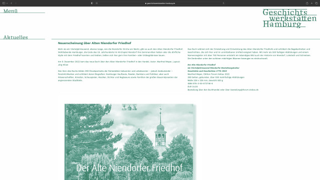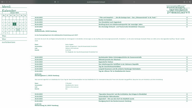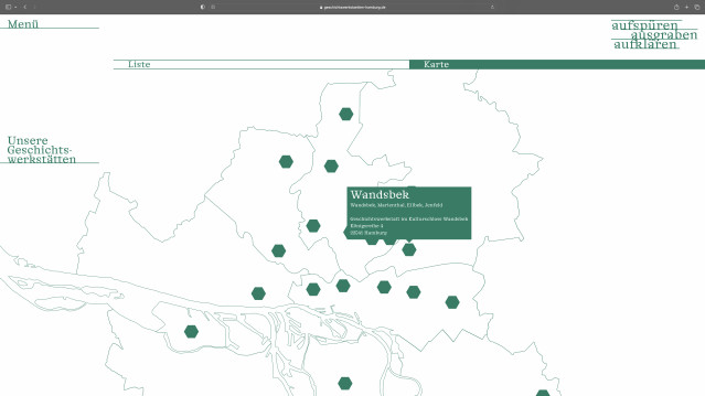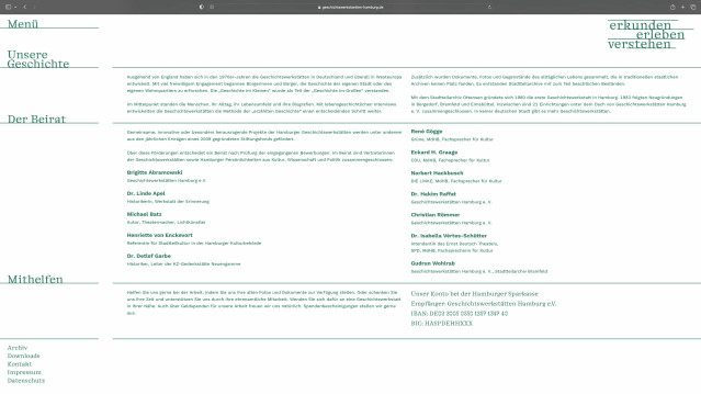 Redesign of the website of the Geschichtswerkstätten Hamburg (History Workshops Hamburg) as part of a new corporate identity. An association that has been researching and communicating Hamburg’s history since the 1980s. It is a clear and cohesive design in a monochromatic dark green. The logo continuously changes to different slogan alternatives when viewing the website to emphasize the versatility of the organization and its working methods.