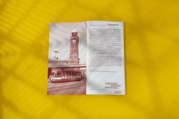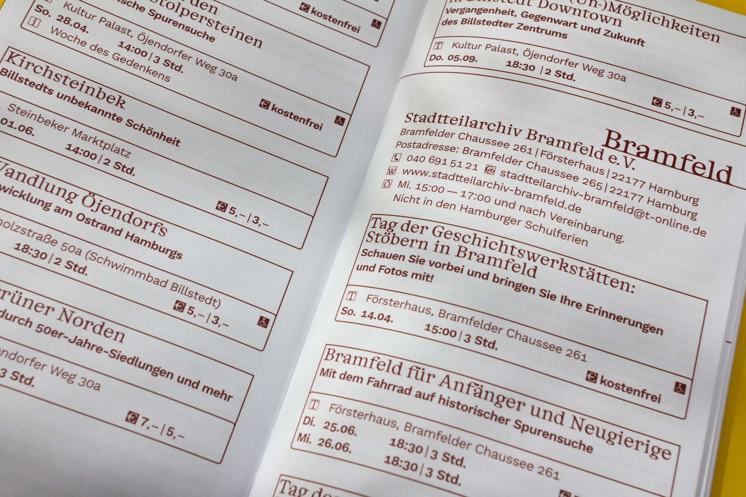 The Geschichtswerkstätten Hamburg (Hamburg History Workshops) offer more than 200 district tours, bicycle tours and walking tours throughout the city each year. The dates are announced annually in the printed program booklet Kiek Mol!, which is available free of charge at the history workshops, public book halls and at numerous other locations in the city.