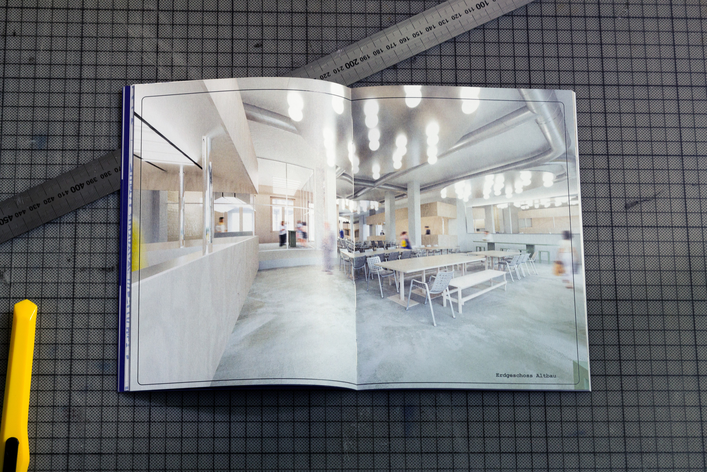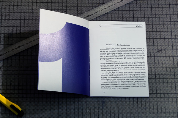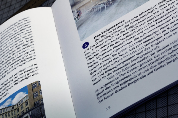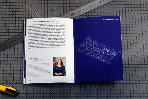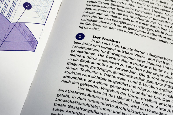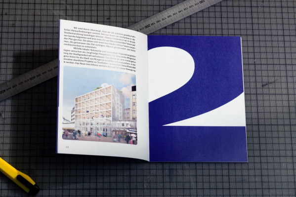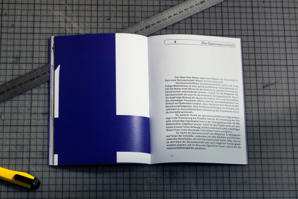 Neues Bauen, Neues Arbeiten (New Building, New Working) is a publication by Neues Amt Altona – a building project of a newly founded cooperative to create a co-working space in Hamburg Altona. The brochure was created within the existing corporate identity and visualizes the construction project through geometric structures and graphic lines.