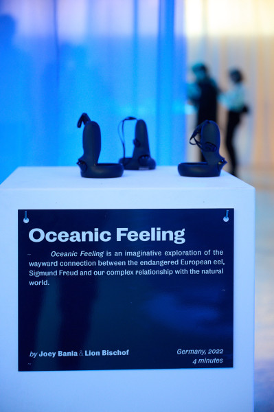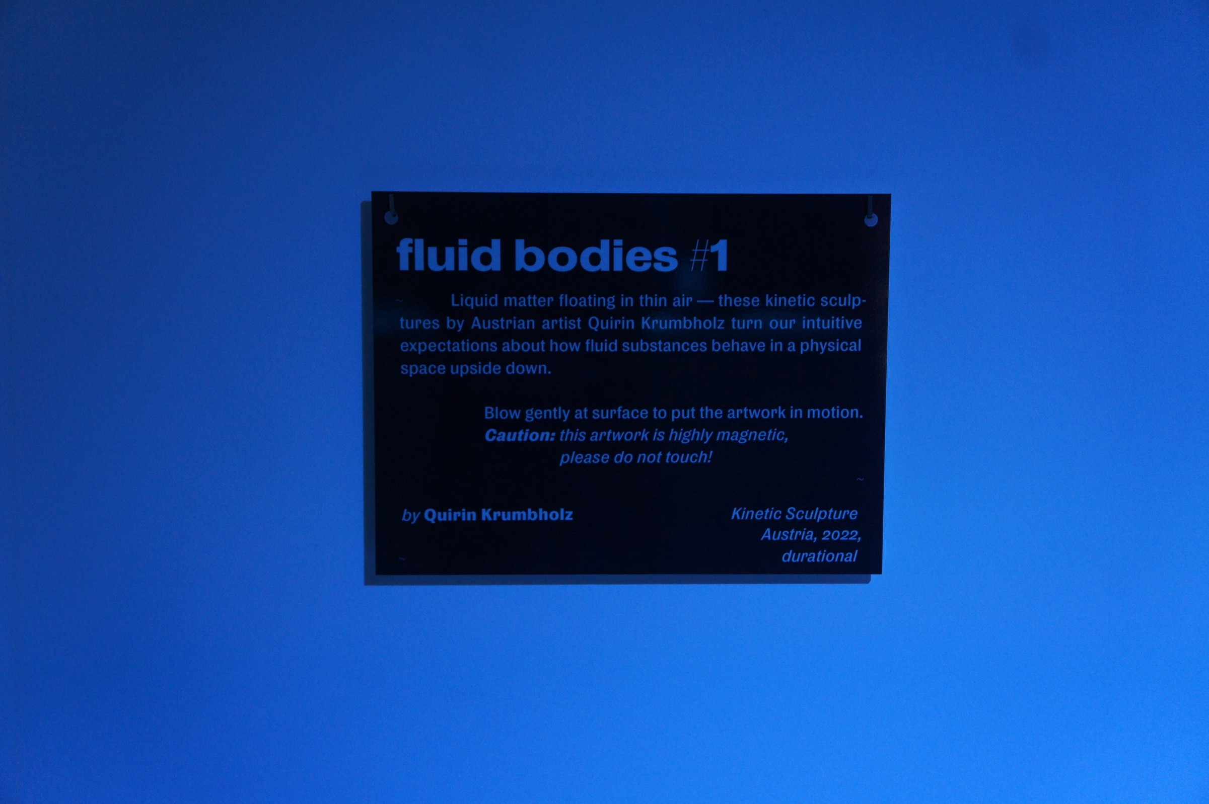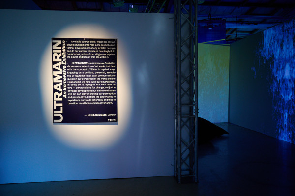 Signage for the exhibition ULTRAMARIN โ An Immersive Exhibition. The exhibition shows international artworks around the subject of โwaterโ and presents works from the fields of virtual and augmented technology, mixed media and projection mapping. The exhibition space is bathed in a deep blue and allows visitors to dive in completely.